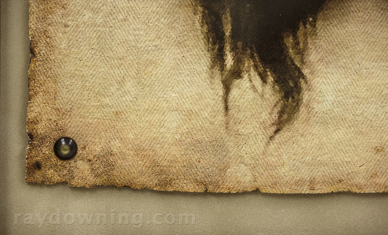Real decorative nails fasten the image to a soft, suede-like background. The print edges have been distressed and antiqued by hand, so each piece is unique. The image has also been antiqued, and it looks as if painted on old fabric.